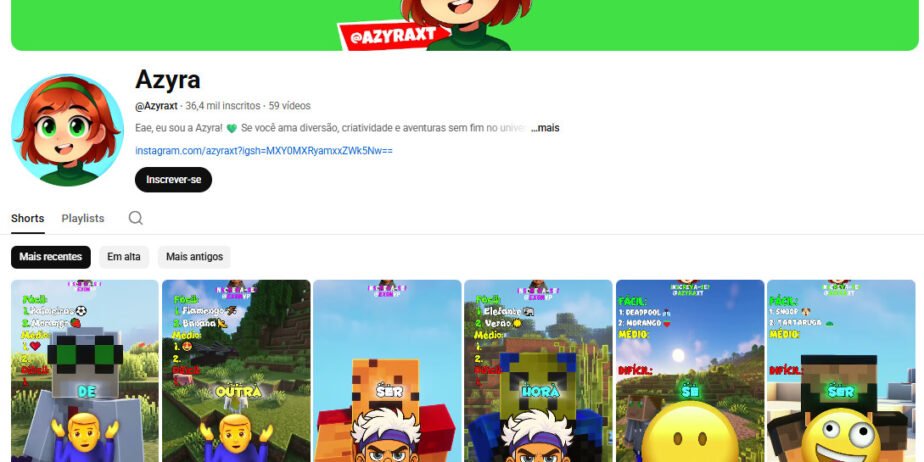 Canal no YouTube à venda – Azyra: Minecraft & Desafios Shorts (36 mil inscritos) não monetizado