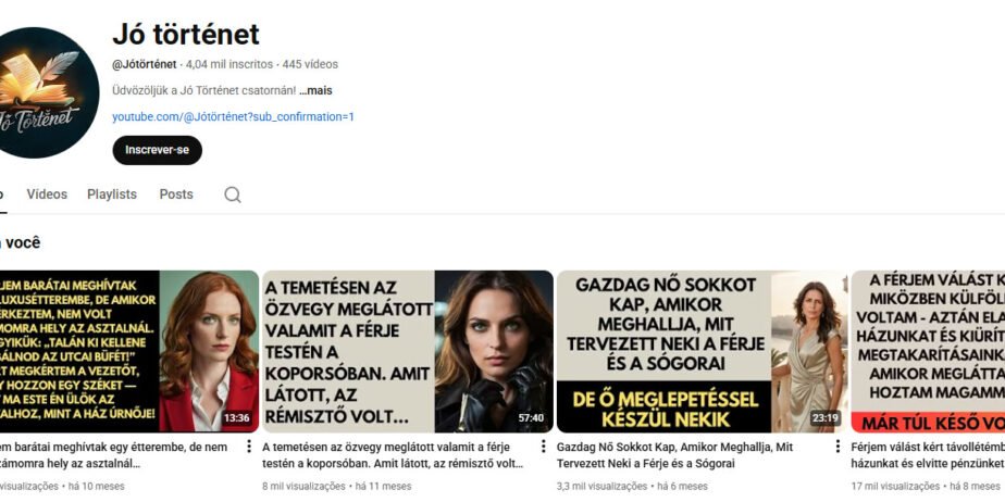 Este canal possui 4 mil inscritos e um vasto histórico de 445 vídeos, focando no nicho de storytelling, dramas familiares e lições de vida. O conteúdo apresenta histórias narradas com títulos e capas instigantes, abordando temas como conflitos conjugais, superação e reviravoltas emocionais. Com vídeos que alcançam marcas sólidas de visualização — como destaques com 17 mil e 4,5 mil views — o canal demonstra uma audiência fiel ao formato de contos dramáticos. Representa uma oportunidade ideal para quem deseja gerir um projeto de entretenimento narrativo com grande volume de conteúdo já publicado.