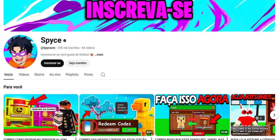 Canal no YouTube à venda – Spyce: Roblox & Desafios (259 mil inscritos)