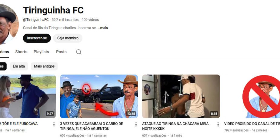 Este canal possui 59 mil inscritos e é dedicado ao nicho de humor e entretenimento, focado em conteúdos sobre as figuras populares Tiringa e Charles. Com uma biblioteca de 409 vídeos, o canal apresenta momentos engraçados, pegadinhas e reações, mantendo uma comunidade fiel de fãs do humor nordestino. Utilizando uma identidade visual autêntica e thumbnails que exploram situações cômicas, o projeto é ideal para quem deseja atuar em um nicho de entretenimento leve com público já consolidado e recorrente.
