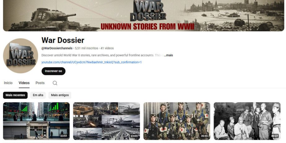 Mergulhe nos arquivos mais profundos do conflito que mudou o mundo com o canal War Dossier, um projeto especializado em revelar histórias não contadas, arquivos raros e relatos poderosos da linha de frente da Segunda Guerra Mundial. A conta possui uma base sólida de 5 mil inscritos e um portfólio de 41 vídeos de alta qualidade.