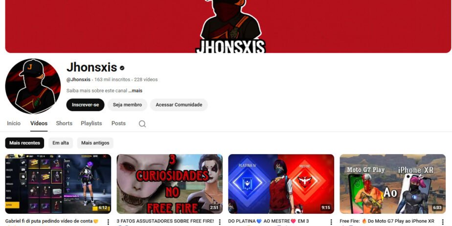 Adquira o canal Jhonsxis (não monetizado), um projeto de grande porte focado no universo de Free Fire e cultura gamer. Com uma audiência expressiva de 163 mil inscritos e 228 vídeos publicados, o canal possui o selo de verificação e uma marca consolidada no nicho.